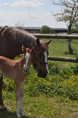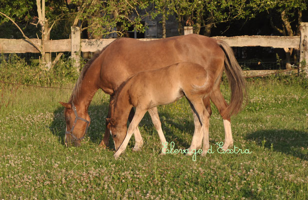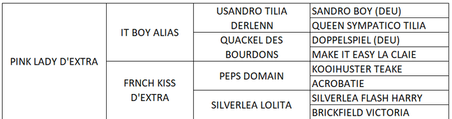 Sa mère : French Kiss d'Extra, est une ponette issue de nos premières générations de poulains. Après avoir tourné sur le circuit classique à 5 ans en CSO avec Nicolas Lebourgeois, elle est ensuite passée sous la selle d'adolescentes. Elle a gravit les échelons pour finir sur les épreuves As 1. Pomme d'amour est sa seconde pouliche.
