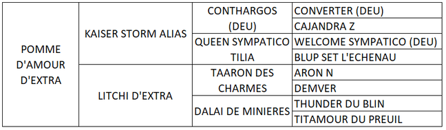 Sa mère : Litchie d'Extra est seconde lors du concours local du Pin à 3 ans. Elle a ensuite eu Pomme d'Amour.